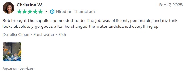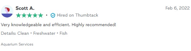 Our standard aquarium service includes cleaning all glass (interior/exterior), monitoring water chemistry, performing water changes, filter replacement, and protein skimmer cleaning. We also offer fish food, new livestock, and drop-in feeding visits upon request.